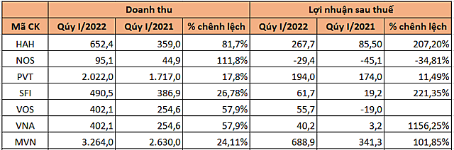 Công ty Vận tải biển Việt Nam (Vosco, HoSE: VOS) và Đại lý vận tải biển (Safi, HoSE:SFI) cũng ghi nhận lợi nhuận tăng mạnh. Vosco ghi nhận lãi sau thuế đạt 55,7 tỷ đồng, tăng mạnh so với khoản lỗ 19 tỷ năm trước còn lãi của Safi quý này gấp 3,2 lần năm trước.