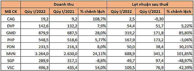 Lợi nhuận của các công ty Đầu tư và Phát triển Cảng Đình Vũ (HoSE: DVP) và Cảng Đồng Nai (HoSE: PDN) ghi nhận tăng lần lượt 5,2% và 30,2%. Cảng An Giang (HoSE: CAG) đã thoát lỗ trong quý này khi ghi nhận lợi nhuận đạt 2,5 tỷ đồng.