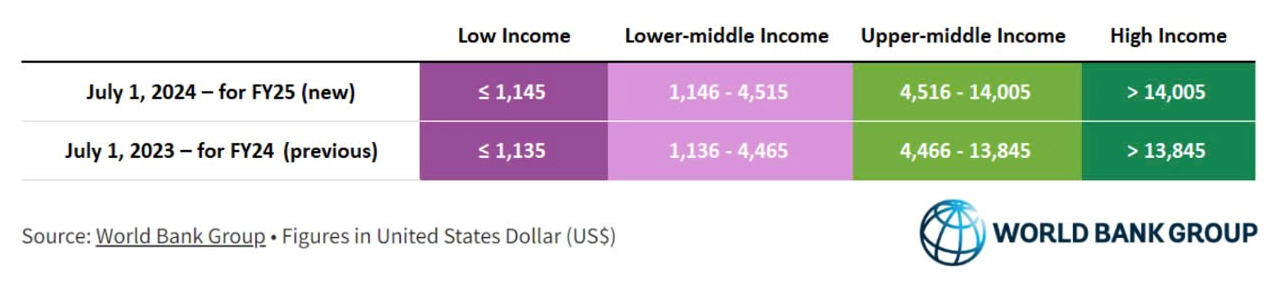 Bảng 1: Phân loại các nước theo tổng thu nhập quốc dân bình quân đầu người (GNI/người): Thu nhập thấp, thu nhập trung bình thấp, thu nhập trung bình cao và thu nhập cao