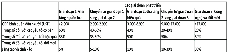 (4) Trên cơ sở phân tích định lượng sự phát triển của 150 quốc gia, báo cáo năng lực cạnh tranh toàn cầu của Diễn đàn Kinh tế thế giới năm 2014 đã chỉ ra các giai đoạn phát triển của các quốc gia trên thế giới tương ứng với mức GDP bình quân đầu người