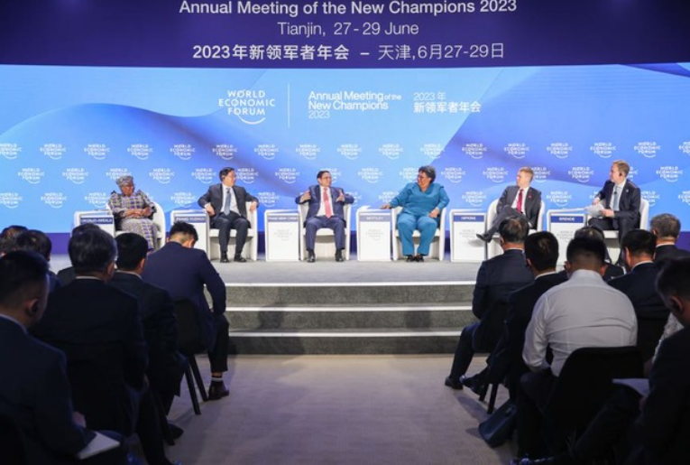 Phiên thảo luận đầu tiên của Hội nghị WEF Thiên Tân diễn ra dưới sự điều hành của Chủ tịch điều hành WEF Borge Brende cùng sự tham dự của hơn 300 đại biểu là lãnh đạo các nước, tổ chức quốc tế và đại diện các tập đoàn, doanh nghiệp lớn trên thế giới. Tham gia thảo luận cùng Thủ tướng Chính phủ Phạm Minh Chính có Thủ tướng New Zealand Chris Hipkins, Thủ tướng Barbados Mia Mottley, Tổng Giám đốc WTO Ngozi Okonjo-Iweala và Chủ nhiệm Ủy ban Quản lý và giám sát tài sản nhà nước Trung Quốc Zhang Yuzhuo.