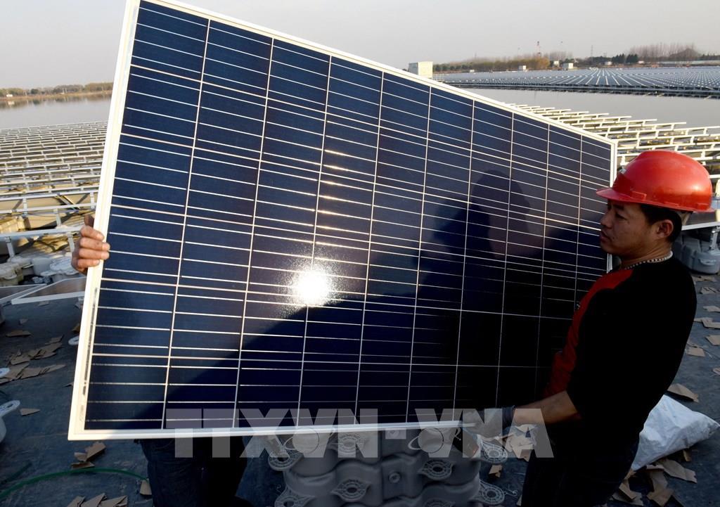 Lắp đặt những tấm pin năng lượng mặt trời tại tỉnh An Huy, Trung Quốc. Ảnh: AFP/TTXVN
