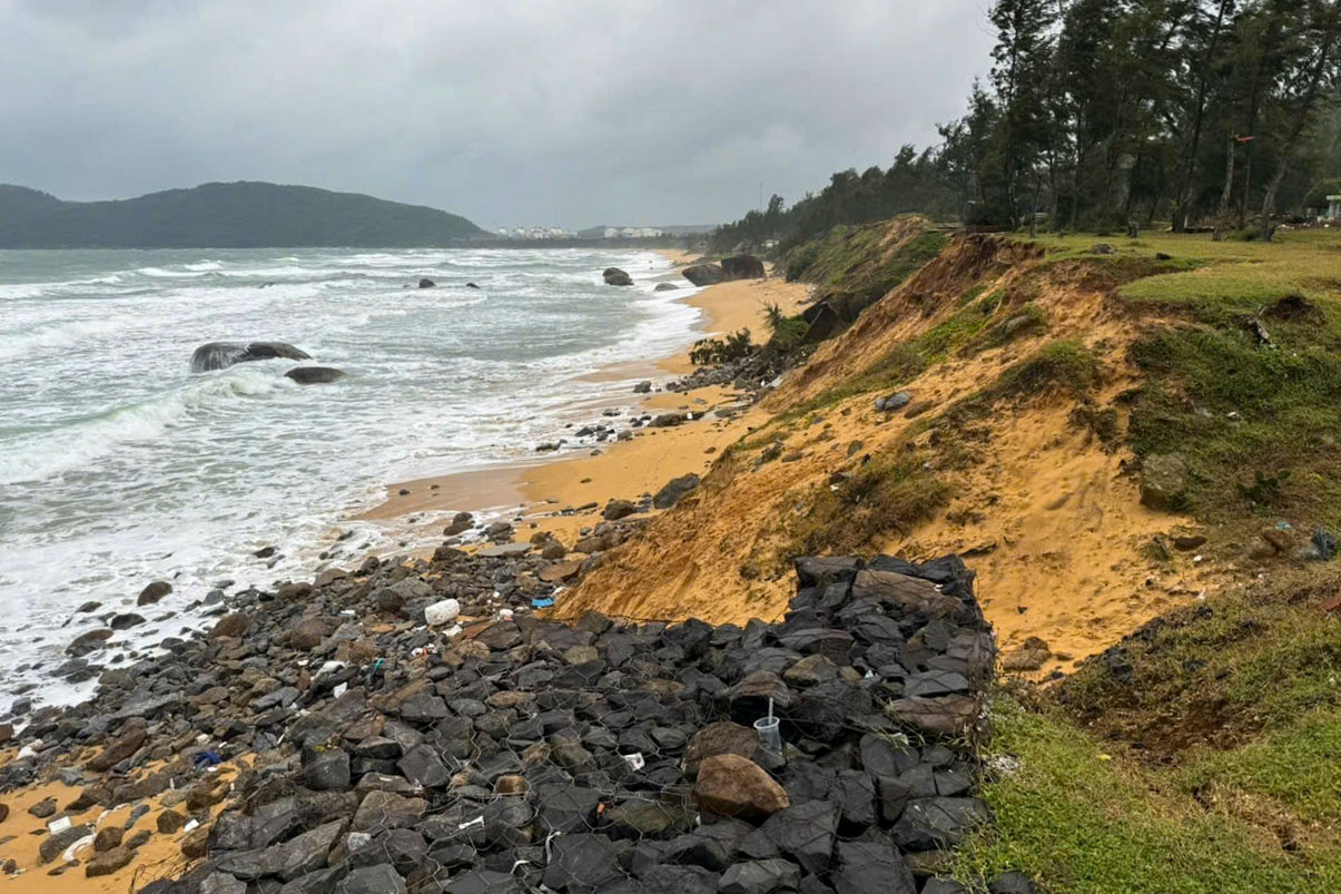 Theo báo cáo của UBND huyện Bình Sơn, thời gian qua, trên địa bàn xảy ra mưa lớn, sóng đập mạnh vào bờ khiến bờ biển bị sạt lở nghiêm trọng tại khu vực từ Đồn Biên phòng Cửa khẩu cảng Dung Quất đến bãi biển Hòn Cóc (thôn Tuyết Diêm 1, xã Bình Thuận).