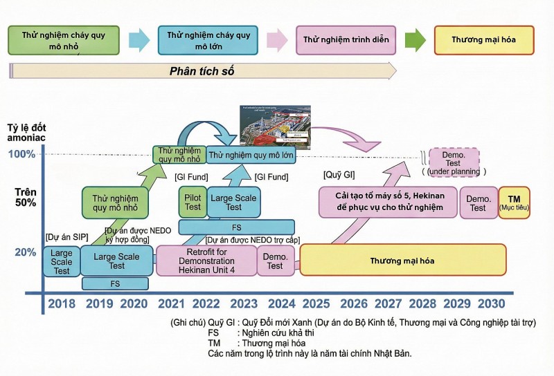 | Hình 3: Lộ trình phát triển công nghệ đồng đốt amoniac với than của Tập đoàn IHI. |