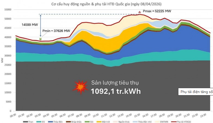 Cơ cấu huy động nguồn điện ngày 8/4/2026 cho thấy vẫn mang tính điển hình. Trong đó: