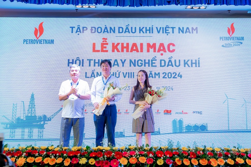 Ông Đỗ Chí Thanh - Phó Tổng Giám đốc Petrovietnam tặng hoa cảm ơn các nhà tài trợ Hội thi. Bà Hứa Thị Yến, đại diện Công ty TNHH SAMSON Việt Nam nhận hoa cảm ơn tại Lễ khai mạc Hội thi. |