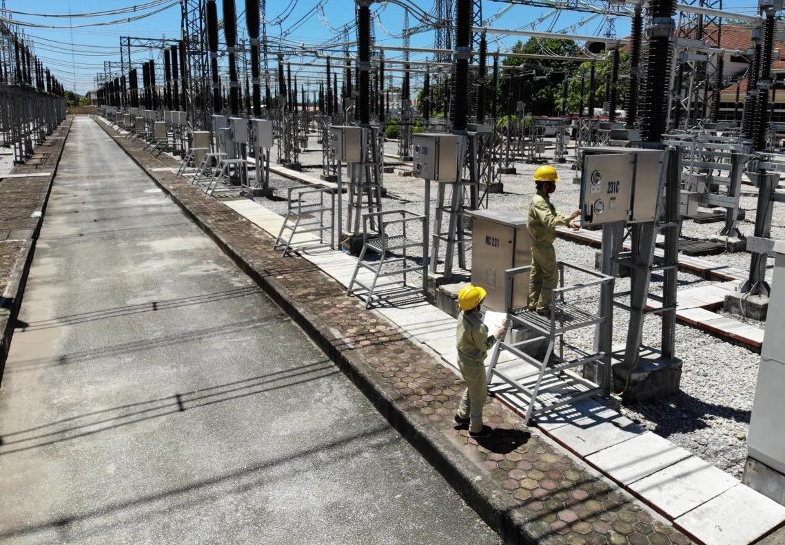 Công nhân trạm biến áp 500kV Nho Quan, Ninh Bình kiểm tra thiết bị truyền tải điện