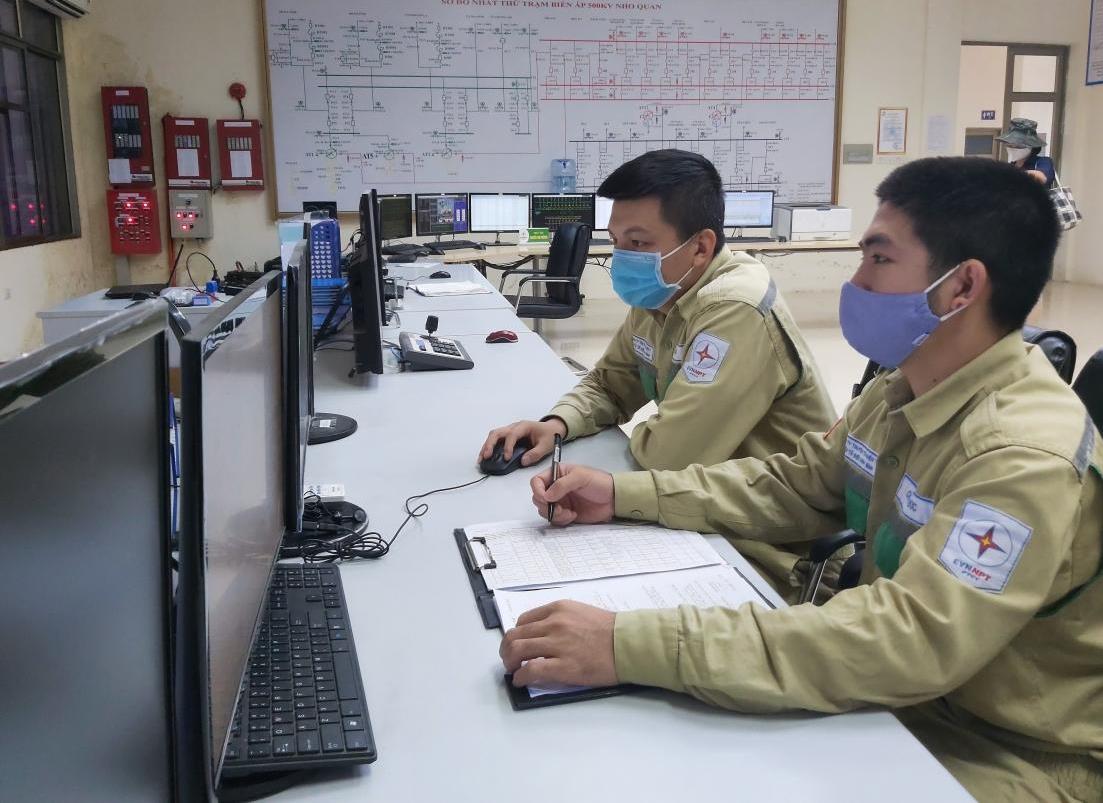 Nhân viên vận hành trạm biến áp 500kV Nho Quan, Ninh Bình liên tục theo dõi, điều chỉnh các thiết bị, đảm bảo truyền tải điện an toàn, hiệu quả