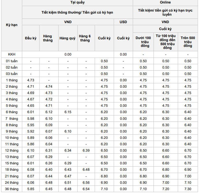 Theo biểu lãi suất công bố, đối với tiền gửi trực tuyến, lĩnh lãi cuối kỳ, lãi suất được phân theo quy mô tiền gửi. Với kỳ hạn 36 tháng, lãi suất online lần lượt đạt 7,10%/năm với khoản tiền gửi dưới 100 triệu đồng, 7,20%/năm với khoản tiền từ 100 – 500 triệu đồng và lên tới 7,30%/năm đối với khoản tiền gửi trên 500 triệu đồng.