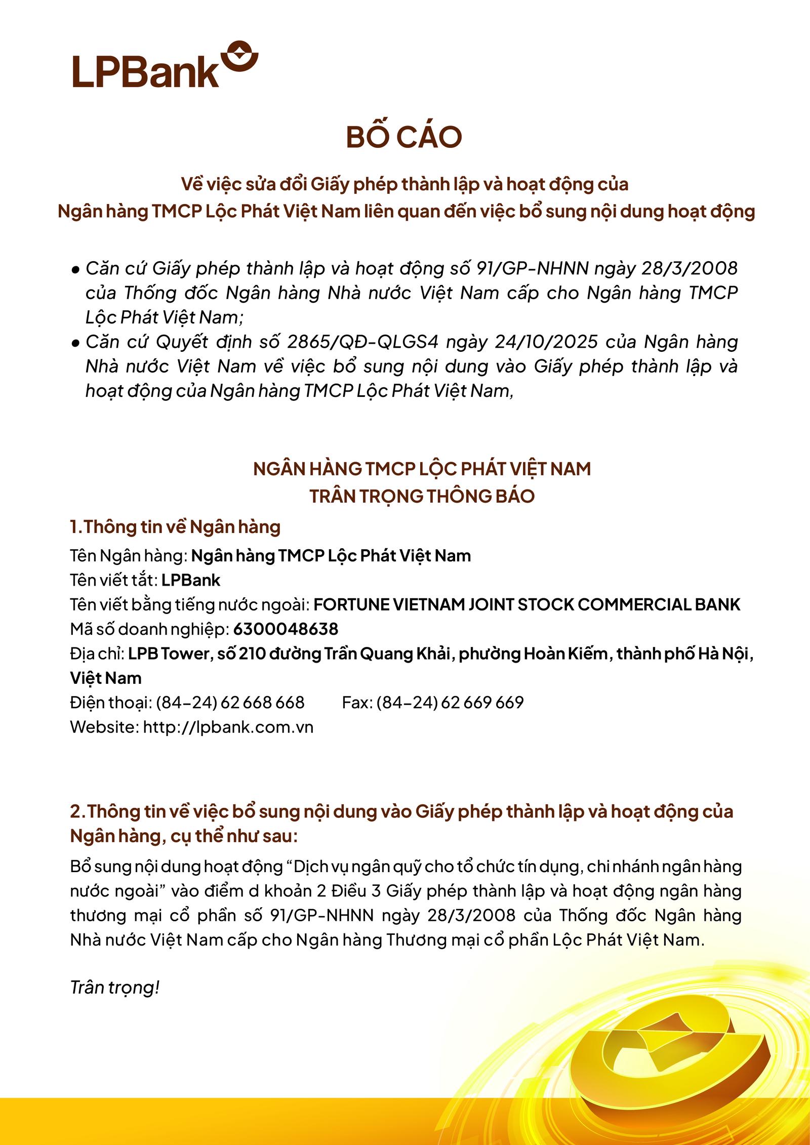 Ngân hàng TMCP Lộc Phát Việt Nam (LPBank) thông báo việc sửa đổi Giấy phép thành lập và hoạt động của ngân hàng liên quan đến việc bổ sung nội dung hoạt động