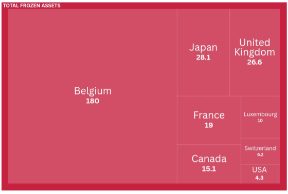 Bỉ là nơi nắm giữ lượng tài sản lớn nhất với khoảng 180 tỷ euro tương đương 209 tỷ USD, chủ yếu thông qua Euroclear tại Brussels vốn là tổ chức giữ hộ một phần lớn dự trữ ngoại hối của Ngân hàng Trung ương Nga.