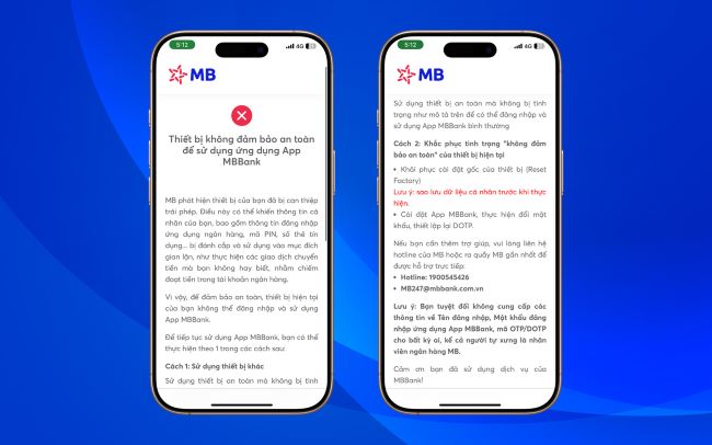 Cụ thể, khi mở App MBBank, hệ thống sẽ tự động quét và kiểm tra môi trường. Nếu phát hiện bất kỳ dấu hiệu đáng ngờ nào, một cảnh báo sẽ ngay lập tức được gửi đến khách hàng, tối ưu an toàn cho người dùng trước khi thực hiện các thao tác có sử dụng dữ liệu cá nhân khác.