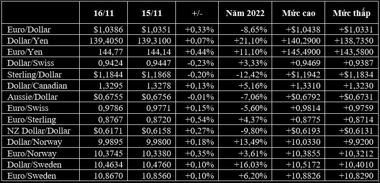 Đồng euro lúc kết thúc ngày 16/11 tăng 0,33% lên 1,0386 USD, nhưng vẫn thấp hơn mức cao nhất 4,5 tháng (1,0481) chạm tới hôm 14/11 khi dữ liệu lạm phát giá sản xuất của Mỹ thấp hơn kỳ vọng. Đồng euro cũng đã lấy lại toàn bộ những gì đã mất ở phiên 15/11 so với yen Nhật, khi EUR tăng 0,44% so với JPY.