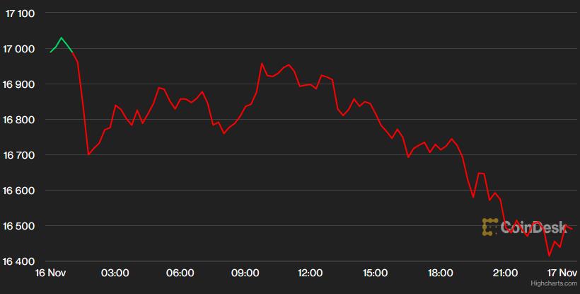 Trên thị trường tiền điện tử, Bitcoin quay đầu giảm xuống mức 16.483 USD vào lúc kết thúc ngày 16/11 theo giờ Việt Nam sau khi không thể vượt qua được ngưỡng 17.000 USD.