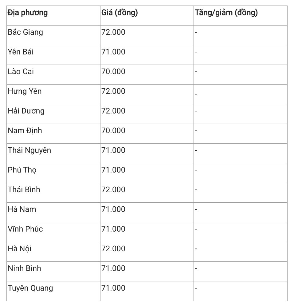 Hiên giá heo hơi khu vực này vẫn duy trì trong khoảng 70.000 - 72.000 đồng/kg. Trong đó, mức 72.000 đồng/kg được ghi nhận tại Hà Nội, Bắc Giang, Hải Dương, Hưng Yên và Thái Bình. Ngược lại, Lào Cai, Nam Định là hai địa phương có giá heo hơi thấp nhất khu vực với mức 70.000 đồng/kg.