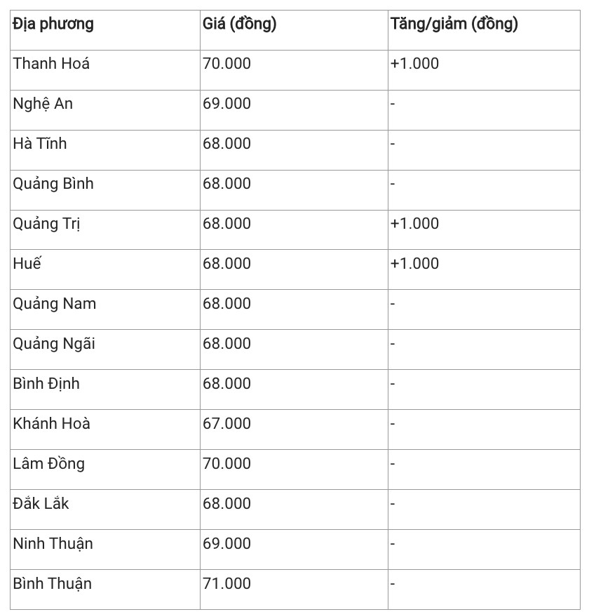 Hiện, giá heo hơi khu vực này dao động trong khoảng 67.000 – 71000 đồng/kg. Trong đó, các tỉnh tỉnh Khánh Hoà là địa phương có giá thấp nhất khu vực với 67.000 đồng/kg. Ngược lại, Bình Thuận có giá heo hơi cao nhất với 71.000 đồng/kg.