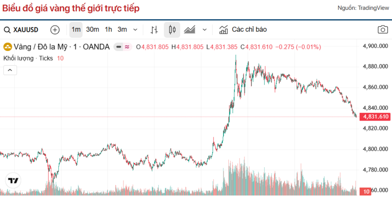 Theo Kitco, giá vàng thế giới ghi nhận lúc 4h30 hôm nay theo giờ Việt Nam giao ngay ở mức 4,831.61 USD/ounce. Giá vàng hôm nay tăng 0,95% so với hôm qua. Quy đổi theo tỷ giá USD trên thị trường tự do (26.545 VND/USD), vàng thế giới có giá khoảng 154,6 triệu đồng/lượng (chưa tính thuế, phí). Như vậy, giá vàng miếng SJC đang cao hơn giá vàng quốc tế khoảng 17,4 triệu đồng/lượng.