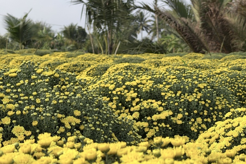 Theo bà Đường Thị Trúc Xuyến (42 tuổi, ngụ ấp An Hòa, xã Chợ Lách) chia sẻ, gia đình bà có ruộng cúc rộng khoảng 1.000 m² với hơn 2.500 chậu đã bung nở vàng rực. Theo bà Xuyến, phải gần nửa tháng nữa mới đến cao điểm xuất bán phục vụ Tết, nhưng toàn bộ vườn hoa đã nở đồng loạt.