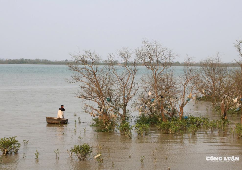 Là người sống gần rừng bần, ông Trần Văn Hải (khối 1 Phúc Thọ, phường Vinh Lộc) cho biết, mỗi khi nước lũ trên sông Lam dâng cao rồi rút nhanh, dòng chảy lại cuốn theo một lượng lớn rác thải từ thượng nguồn đổ về. Trong đó, một phần rác bị cuốn trôi ra biển, nhưng phần lớn vẫn mắc lại trên thân, cành cây và dọc bờ sông. Khi nước rút, cả khu rừng bần lộ ra với những “cây rác” đủ loại, phủ kín từng tán lá, cành cây. Nhất là sau các đợt mưa lũ cuối năm 2025, một lượng lớn rác thải đã mắc lại trên thân cây, cành cây và dọc bờ sông.
